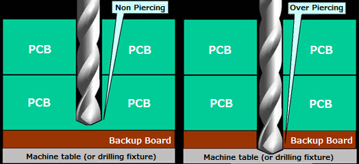 钻孔时全长管控不良、上环不良、设定值输入错误等造成底板钻孔未透、或者下钻到孔钻机台面(或治具板)的现象称之为孔未透或下钻过深。