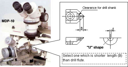截面形状为半球U形的钻尖切刃支架。1个V槽限定对应1种直径钻头,如芯高不变,基本可得到理想的刀面角度。