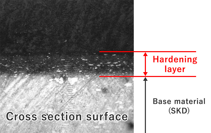 The HT treatment can improve the tool life by increasing the dies surface hardness. Combining the treatment with SKD material, the price will be similar to the SKH made dies but with longer tool life. (The HT process is also available for SKH) Surface hardness: 1,200HV0.1 or more *HT surface treatment is a special surface treatment from UNION TOOL.