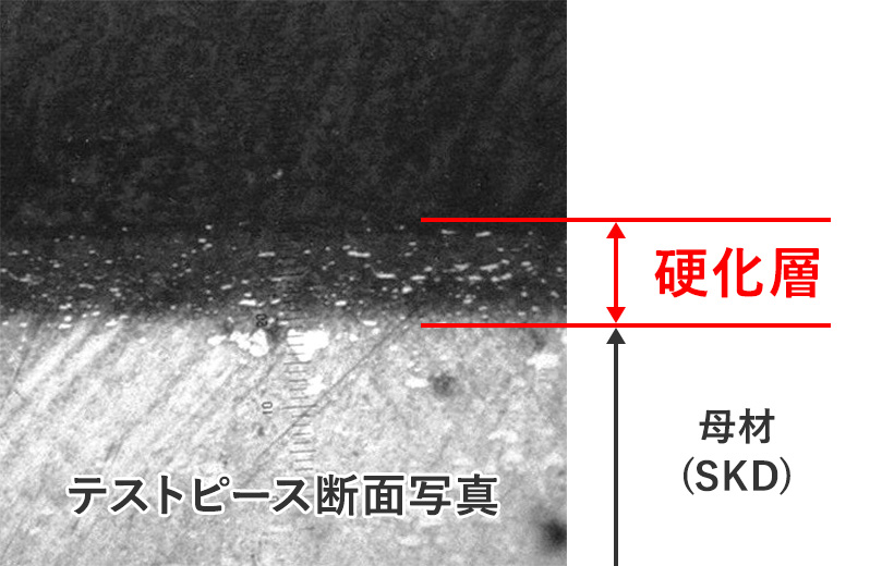 HT表面処理を施すことにより、工具表面硬度を大幅に高め、従来の転造ダイスと比べ工具寿命を改善する事が可能です。母材はSKHより安価なSKDを用いることで、価格を抑えることが可能です。従来と同等なコストで長寿命を得ることができます。(SKHへの処理も可能です)