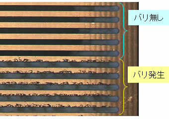 バリ発生までの距離、発生頻度、大きさ、目視での官能評価を行います。