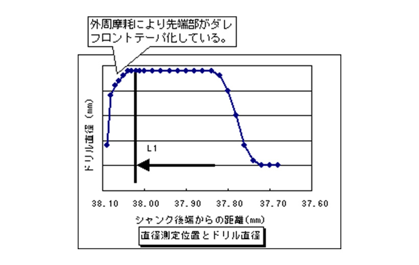 例えば、下図のようにフロントテーパが発生している場合について、ドリル先端部の直径を細かいピッチ(0.01~0.02mm程度の間隔)で測定評価します。そのデータにより再研磨取り量を算出します。