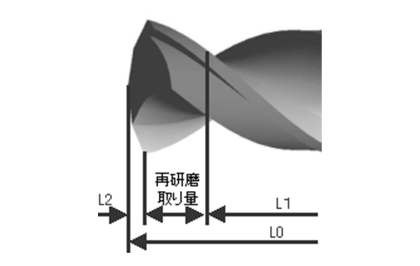 完全に先端摩耗部を取り除く為に再研磨取り量を大きくすると、下記のような悪影響を穴品質に与える場合があるので注意が必要です。 ・溝体積減少、溝長減少による切り屑詰まり発生→内壁粗さ、穴位置精度の悪化