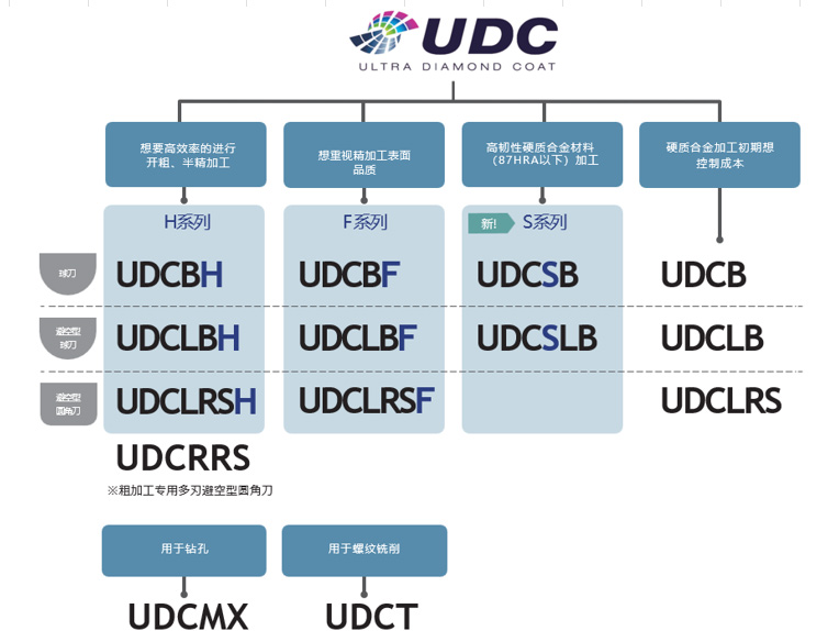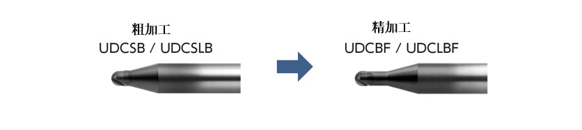 UDC-H系列是、同F系列不同的刃尖处理,改良的金刚石涂层,实现了难以想象的硬质合金高效率直接加工,大大提高了除去体积效率,适合从开粗到中精加工,值得期待的UDC第三代系列产品。 与之前发售的F 系列一起使用的话,可以高效率高质量地进行超硬合金的直接切削。