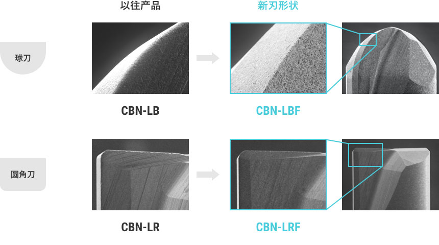 采用了适合加工高硬度材料的CBN素材,通过改良刃形设计, 实现了高精度及长寿命加工。优化了耐磨性及耐折损性, 能于长时间加工, 实现高光洁度和精度。