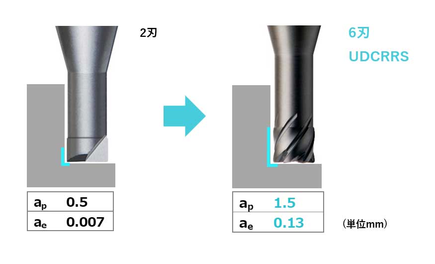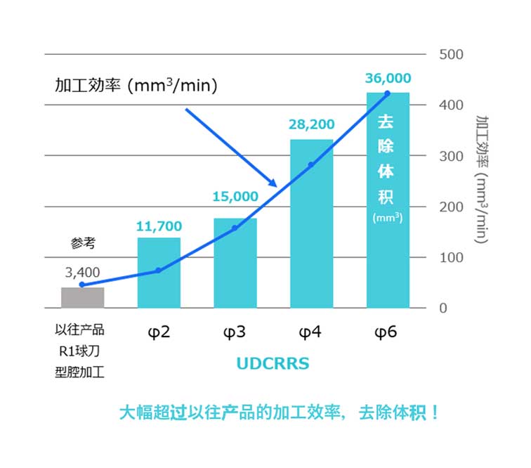 采用了UDC(UltraDiamondCoating)系列, 可以长时间及稳定地加工硬质合金。配合最适当的刀刃形状设计, 使惊异的大切「深」变得可能, 实现了对硬质合金的高效率, 高精度的加工效果。