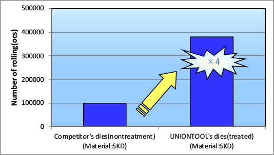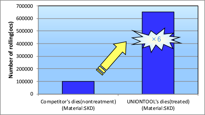 The HT treatment can improve the tool life by increasing the dies surface hardness. Combining the treatment with SKD material, the price will be similar to the SKH made dies but with longer tool life. (The HT process is also available for SKH) Surface hardness: 1,200HV0.1 or more *HT surface treatment is a special surface treatment from UNION TOOL.
