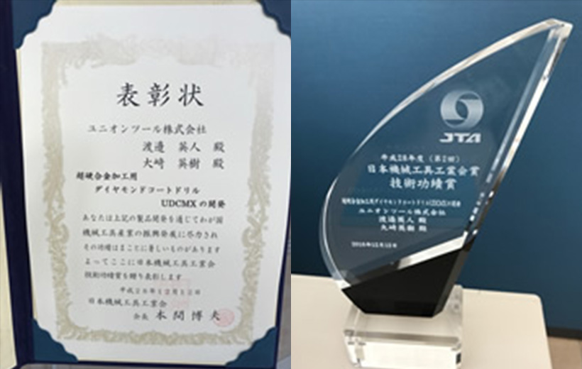 UNION TOOL CO. has received "Technical Achievement Award 2016" from Japan Cutting & Wear-resistant Tool Association for the development of diamond coated drill "UDCMX series" designed for drilling cemented carbide.