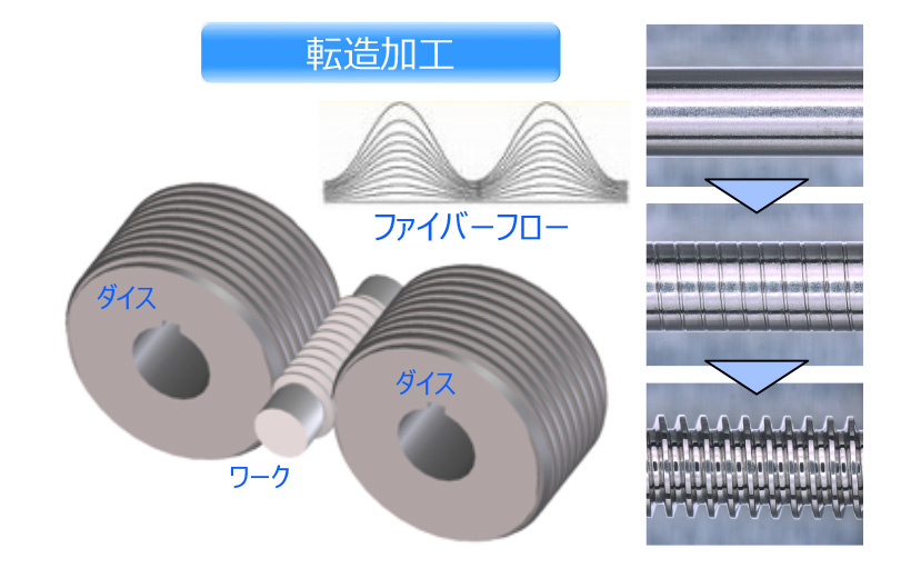 ダイスと被転造製品が擦りあわさりながら成型される過程で、バニシ効果が起こり工具表面以上の良好な加工面粗さを得られる。