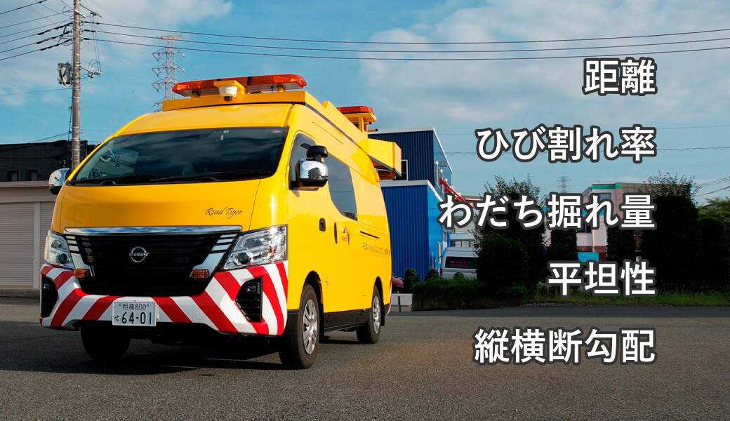 人工衛星を利用した高精度位置情報と路面性状3要素とを同期測定することで、距離標との対応付けや帳票作成作業を効率化