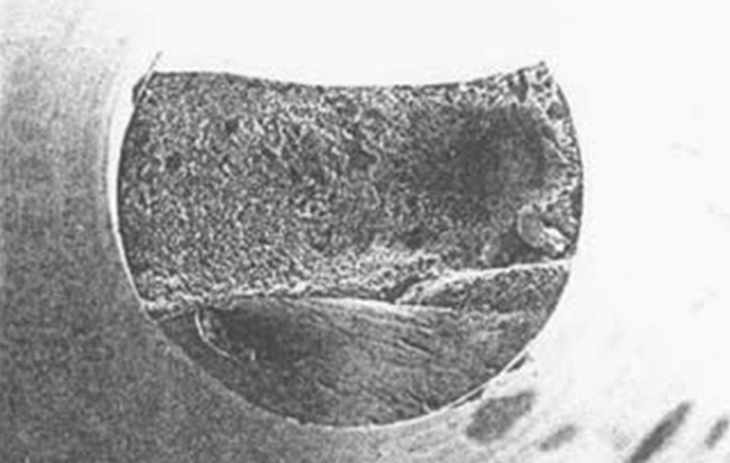 穴明け加工中の折損をいう。折損の形態には、曲げ折損、ねじれ折損等があり、曲げ折損はドリルの横方向への負荷によるもので溝の根元付近での折損が多く、ねじれ折損はトルク大によるもので溝の中間等根元以外の部分での折損が多い。
