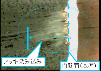 • 加工穴のクロスセクションを行い、メッキの染み込みが大きく発生している箇所を測定します。