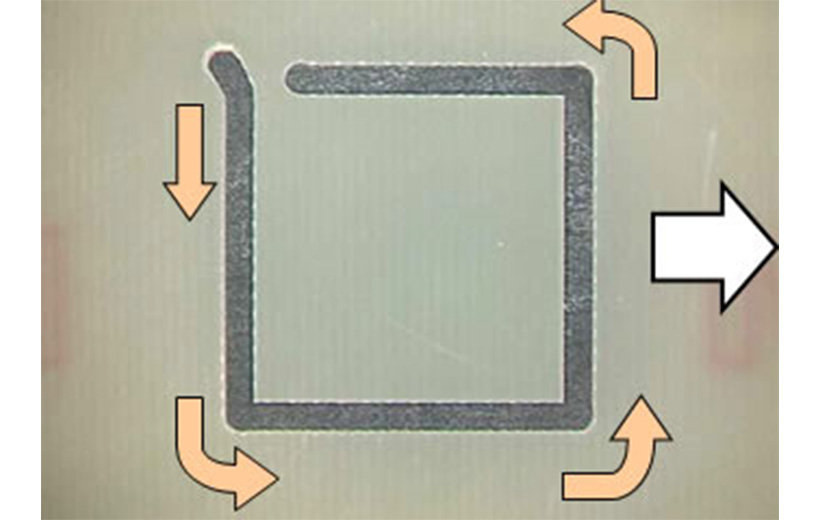 基板のバタつき | 基板の固定が不十分な場合、加工中に基板が動くことによって精度良く加工出来なくなる | 基板をしっかり固定する(ピンやテープを用いて確実に固定する) |