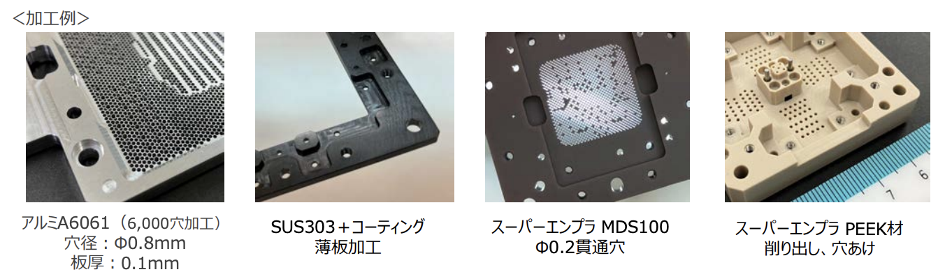 主にアルミ、SUS、樹脂の微細穴明け~小径加工を得意としている。
