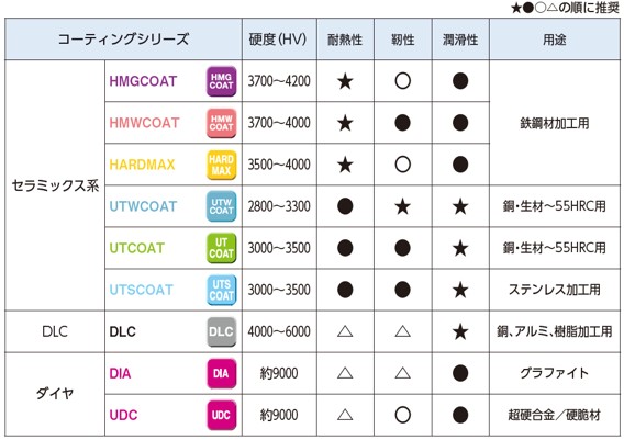 高硬度材加工時における耐摩耗性を極限まで高めたHMGCOATを採用したシリーズです。