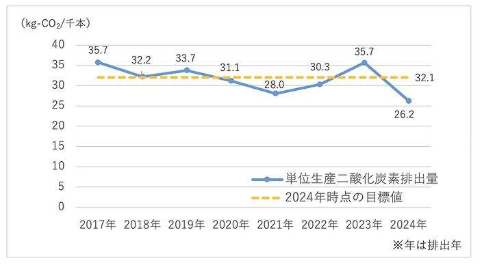 省エネルギー化 | 2024年度までに単位生産二酸化炭素排出量※4を2019年度比5%改善 | 2023年度エネルギー起源二酸化炭素排出量※5の1%相当を改善により削減する |